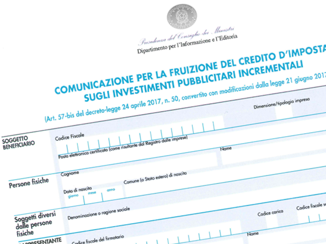 Fino al 31 ottobre 2019 è possibile presentare la comunicazione per l’accesso al credito d’imposta per investimenti pubblicitari incrementali. L’invio della comunicazione può essere effettuato solo nell’area riservata. Info presso le nostre sedi.