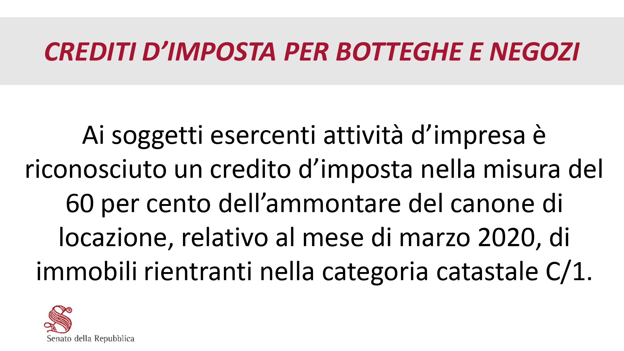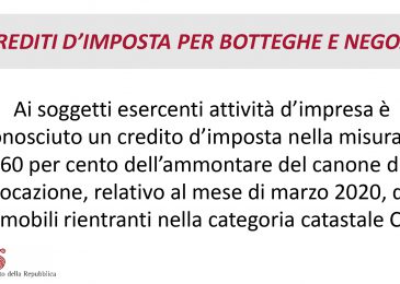L’Agenzia delle Entrate fornisce i primi chiarimenti sul credito d’imposta per il canone di locazione del mese di marzo, relativo agli immobili rientranti nella categoria catastale C/1 “negozi e botteghe”. L’articolo 65 prevede che “Al fine di contenere gli effetti negativi derivanti dalle misure di prevenzione e contenimento connesse all’emergenza epidemiologica da COVID-19, ai soggetti esercenti attività d’impresa è riconosciuto, per l’anno 2020, un credito d’imposta nella misura del 60 per cento dell’ammontare del canone di locazione, relativo al mese di marzo 2020, di immobili rientranti nella categoria catastale C/1, “negozi e botteghe” (il credito d’imposta non si applica alle attività che sono state identificate come essenziali, di cui agli allegati 1 e 2 del D.P.C.M. 11 marzo 2020 ed è utilizzabile, esclusivamente, in compensazione).