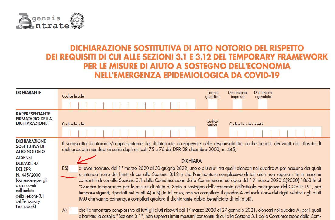 Con la dichiarazione sostituiva è possibile attestare che l’importo complessivo dei sostegni economici fruiti non superi i massimali indicati nella Comunicazione della Commissione europea “Temporary Framework” e il rispetto delle varie condizioni previste.